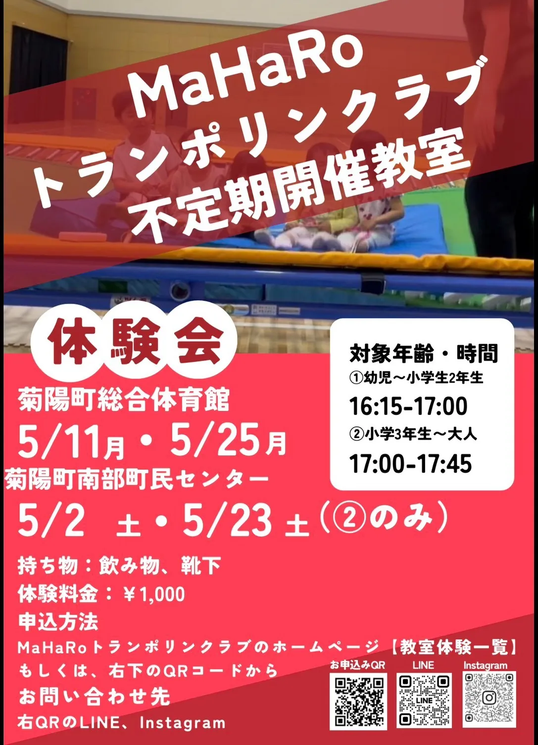 不定期開催教室(菊陽町総合体育館・南部町民センター)の2026年5月のトランポリン体験会のご案内をさせていただきます。