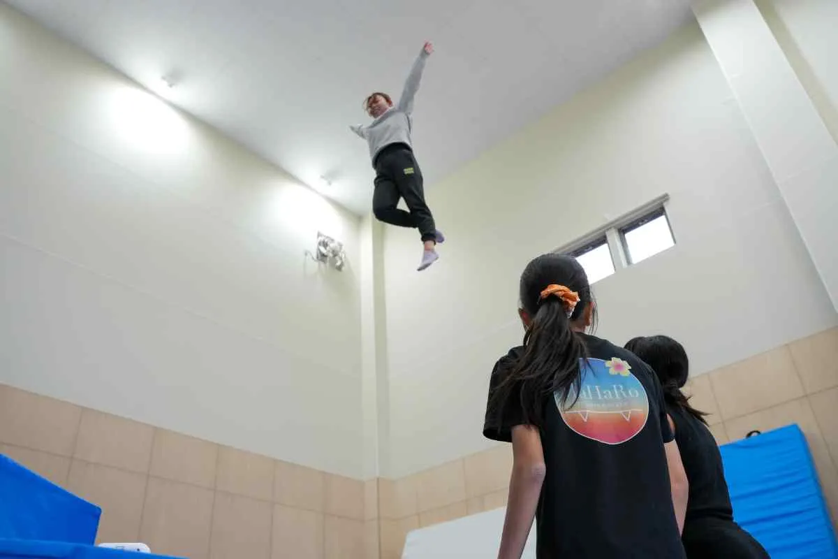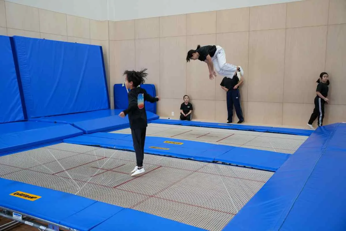 心と身体の成長を見守り、確かな達成感と喜びを味わえるトランポリン教室として、拠点を菊陽町に構えて教室を開いております。広めの駐車場がありますので、大津町、合志市、熊本市からもお車で通っていただけます。運動が苦手な初心者でも、跳びはねるだけで無理なく身体を動かせますので、気軽にお問い合わせください。エアコン完備で様々な設備も充実しており、夏場でも涼しく快適に練習に励むことができます。