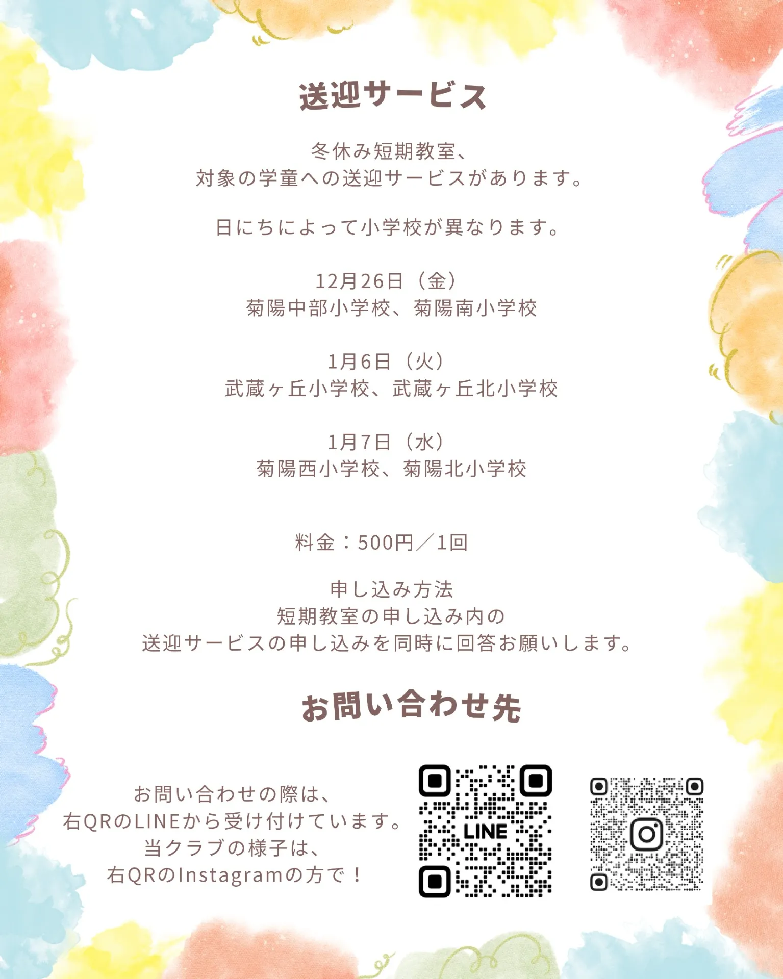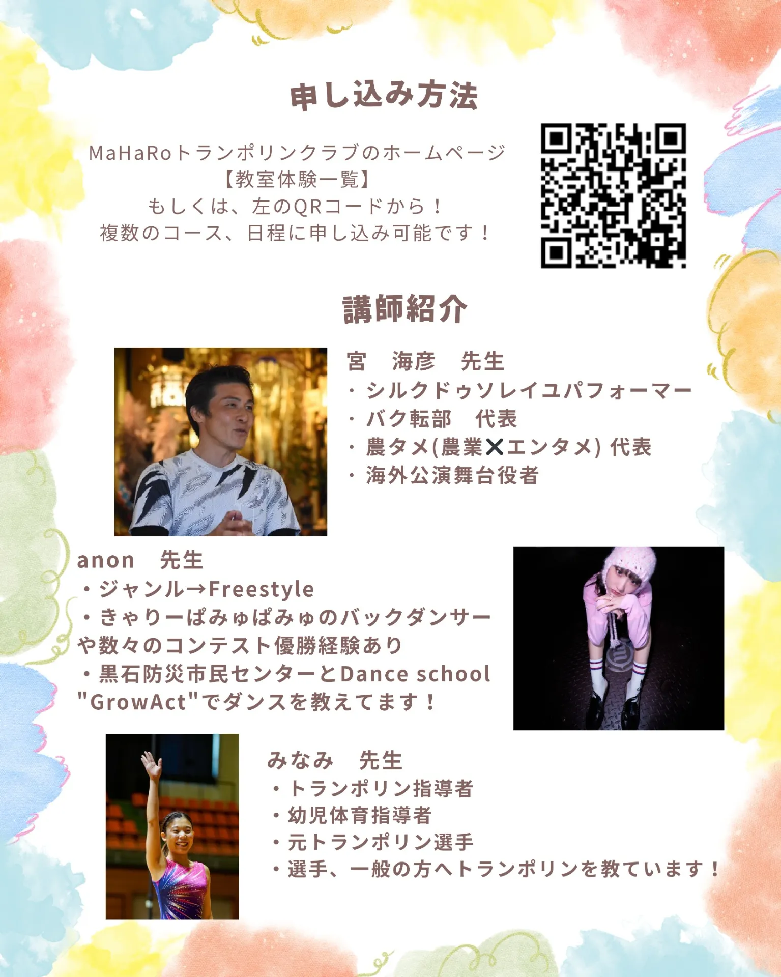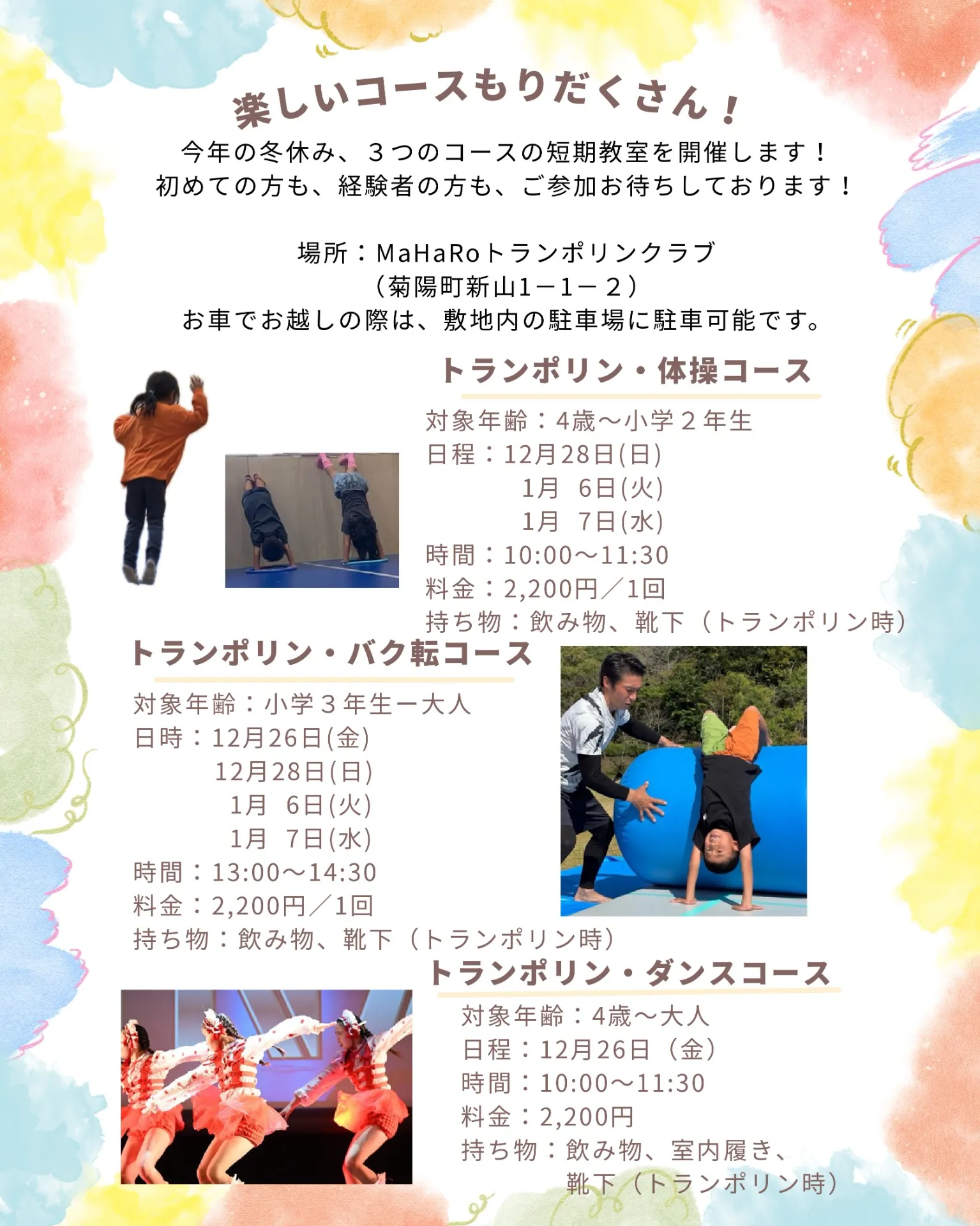 MaHaRoトランポリンクラブ 冬休み 短期教室(トランポリン&体操&ダンス&バク転) 2025/11/26 こんにちは MaHaRoトランポリンクラブです! 冬休みの短期教室の日程、教室内容等公開しました。 申込は現在募集中の教室一覧ボタンよりできます。 菊陽町の小学校の学童への送迎サービスも行います。 生徒募集