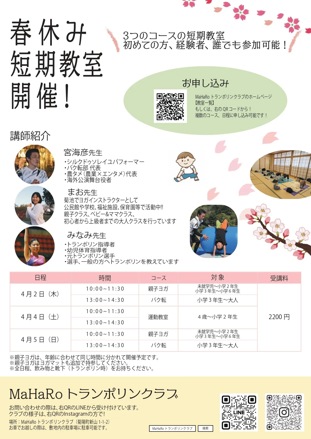 【新山教室】春休み 短期教室(トランポリン&バク転&親子ヨガ&運動教室)申込開始しました 2026/02/23 こんにちは MaHaRoトランポリンクラブです! 冬休みの短期教室の日程、教室内容等公開しました。 詳細は、現在募集中の教室一覧ボタンより参照お願いいたします。 生徒募集